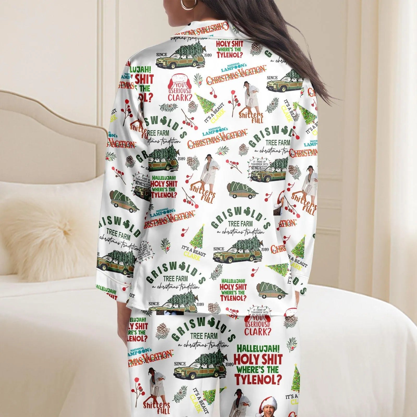 They’re inspired by the iconic National Lampoon’s Christmas Vacation holiday spirit, crafted from silky-smooth satin for ultimate comfort, and designed for matching family sets — perfect for cozy nights, laughter-filled moments, and festive holiday photos.